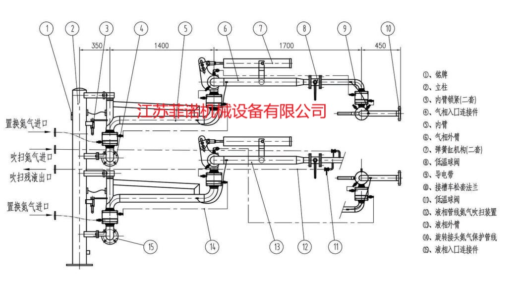- 外臂:可在水平面和垂直面的范圍內轉動,主要用于裝卸臂同槽車、槽船調整對接工作位置的部件