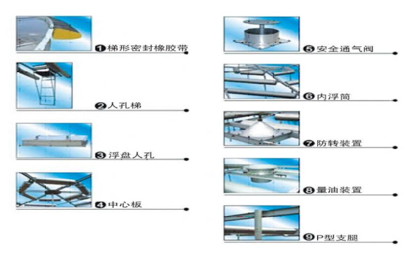 浮子:采用鋁合金板、冷拔成形的無縫鋁管制成浮筒,確保浮筒不會漏油,其浮力設計超過浮盤總重量的兩倍。