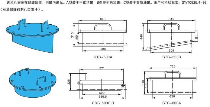 透光分類:A型裝于平錐項罐,B型裝于拱項油罐,C型裝于重質油罐,D非標定做。